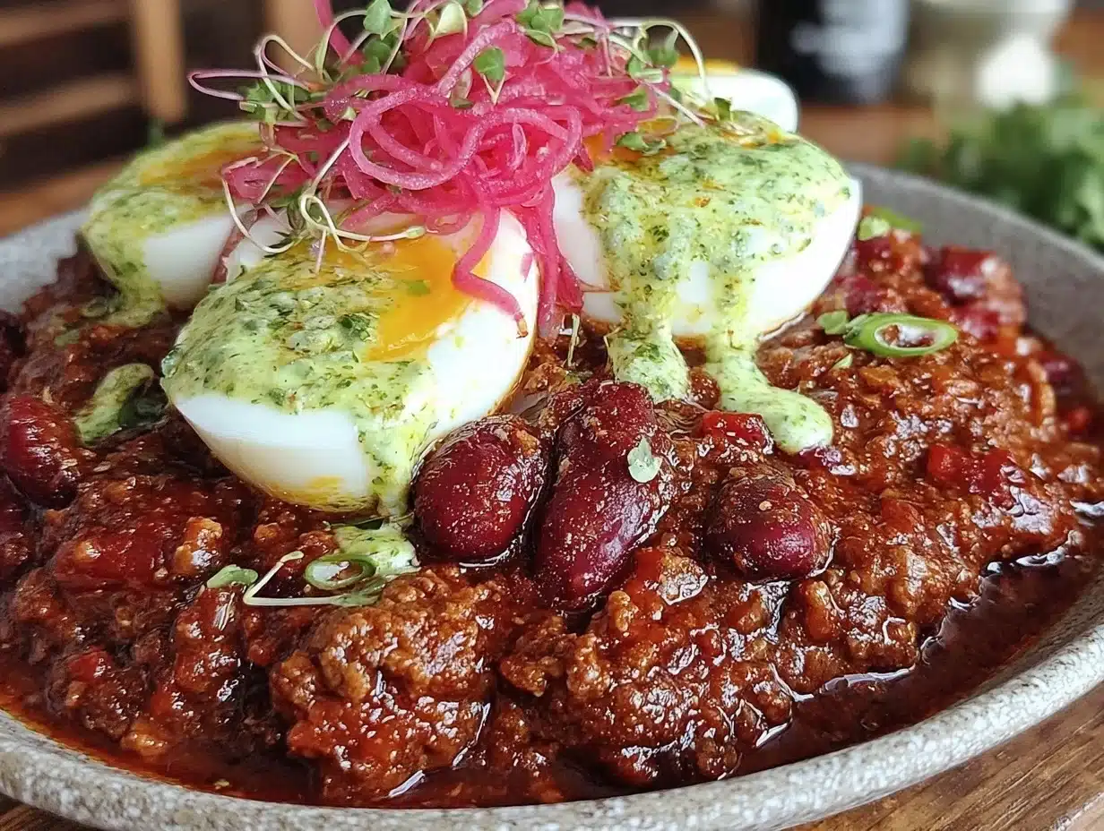 What sets this recipe apart? The soft-boiled eggs are gently cooked to give that silky yolk which melts into the chili, creating an indulgent texture. And the pickled onions? They’re the secret weapon that cuts through the richness, adding a fresh zing that keeps each bite exciting. This isn’t just good—it’s the kind of meal that makes you close your eyes after the first spoonful. It’s comfort food with soul, but without the heaviness. Perfect for impressing guests or turning a simple dinner into a memorable feast.